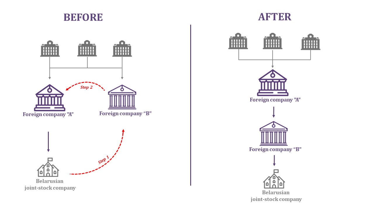 • step 1 - contribution of the rights to the shares of the Belarusian joint-stock company to the share capital of the foreign company "B";