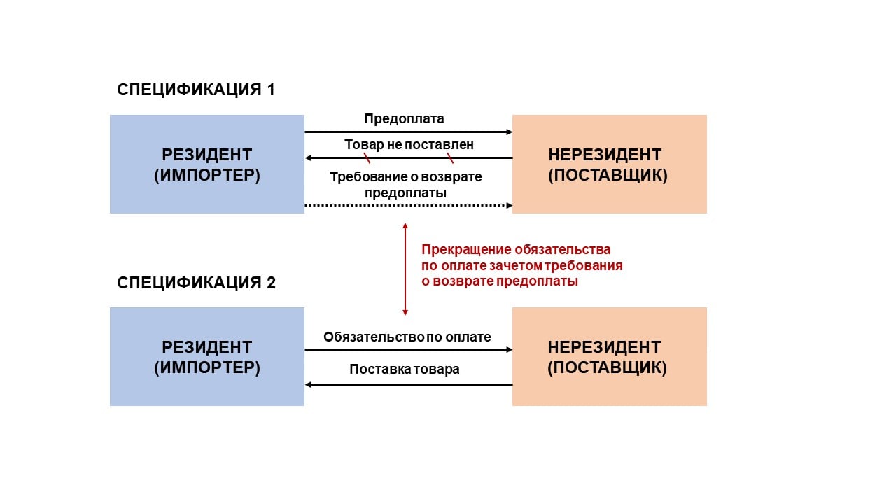 Может возникать вопрос о прекращении зачетом обязательства и требования, в отношении которых, обязательство по репатриации не распространяется. Например, обязательство резидента по оплате уже поставленного товара и обязательство нерезидента по внесению предварительной оплаты. В данном случае возможно прекращение обязательства по предварительной оплате зачетом требования по оплате товара, если: