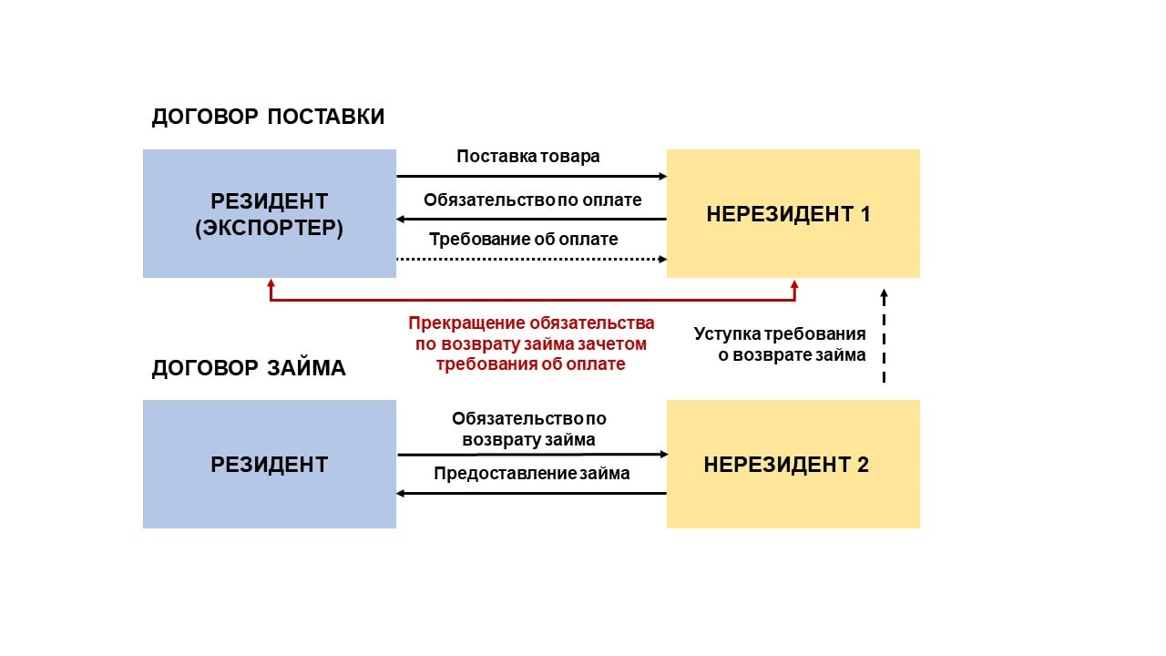 Например, резидентом с нерезидентом-1 заключен экспортный договор поставки, а с нерезидентом-2 заключен договор займа, по которому нерезидент-2 предоставил резиденту займ. Нерезидент-2 уступает нерезиденту-1 требование к резиденту о возврате займа. Резидент уведомлен о состоявшейся уступке требования.