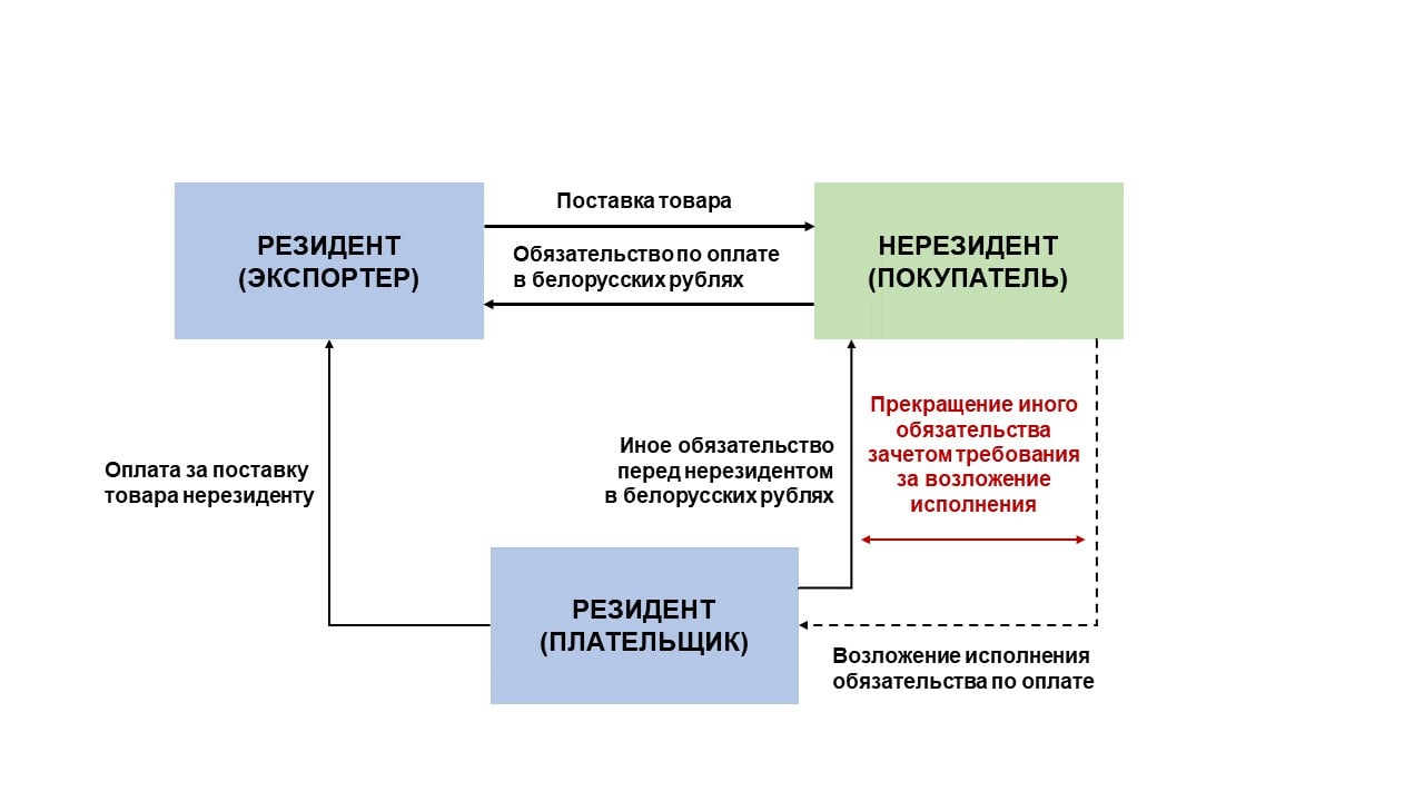 Условие 1: обязательство нерезидента должно быть выражено в белорусских рублях. Следовательно, если исходное обязательство выражено в иностранной валюте, то оно должно быть изменено на обязательство в белорусских рублях. Нерезидент возлагает исполнение на иное юридическое лицо-резидента;